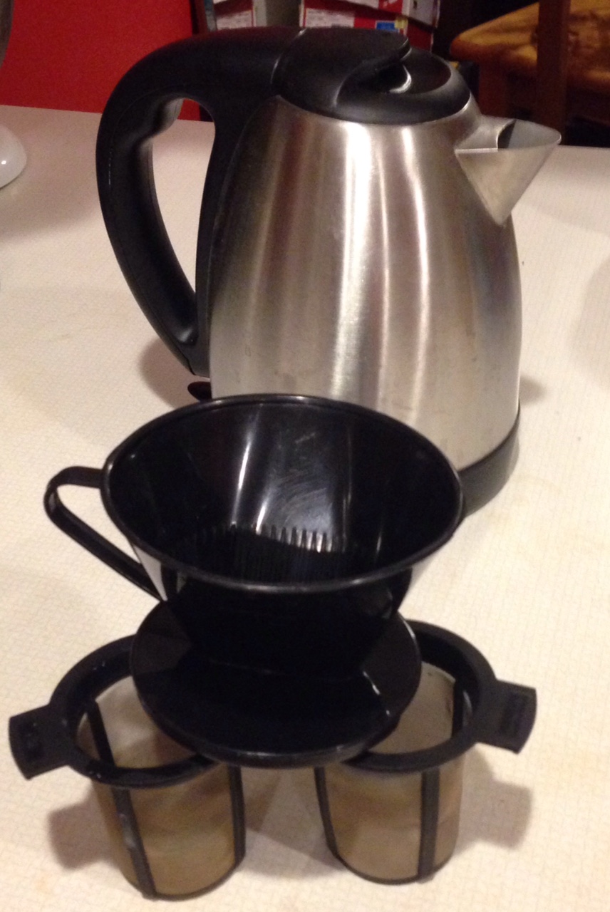 Her tea strainers are cup-shaped frames with sides of fine mesh. They allow better water circulation than ball-shaped infusers. Each holds enough leaves for a single mugful; I use two, so she can have a bonus cup before leaving for work.  For coffee, I use unbleached paper filters in a 2-cup sized cone-shaped cup-top holder. Both brews require very hot water, which comes from a trusty electric kettle that I have wanted since I first saw one in London. It’s fast, doesn’t take up a burner on the stove, and shuts itself off when the water boils rather than shrieking for attention. Also, in a pinch, you can hard-boil eggs in it. We each have a favorite mug for home, and travel mugs for carrying a cup to work. The mugs are never interchanged. There are other ways of making coffee and tea, but these tools are the ones we use most often; they give us the best results with minimal effort. We own a 12-cup Mr. Coffee and a nice teapot, but neither is used except when company comes calling.