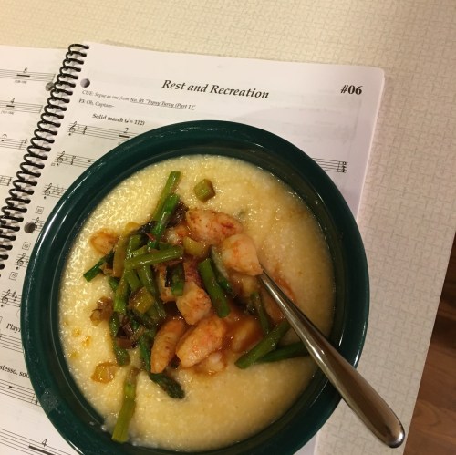 Oh, sure, you could start with fresh shrimp, using the shells to make stock—but that would take longer, and after a night like this there’s no way you’d have the patience for that sort of thing. And if you’ve got leftover shrimp in the fridge, you really ought to use it. Purists will also grouse that asparagus has no business being in shrimp and grits. To such purists we say: pbbbbt. We like asparagus, we had some on hand that needed to get out of the crisper in time for Tuesday’s CSA delivery, and another vegetable in the dish made me feel less guilty about not serving a salad alongside. Why cut the shrimp into pieces first? Because when dinner is served this close to midnight you want it to be as easy to eat as possible.