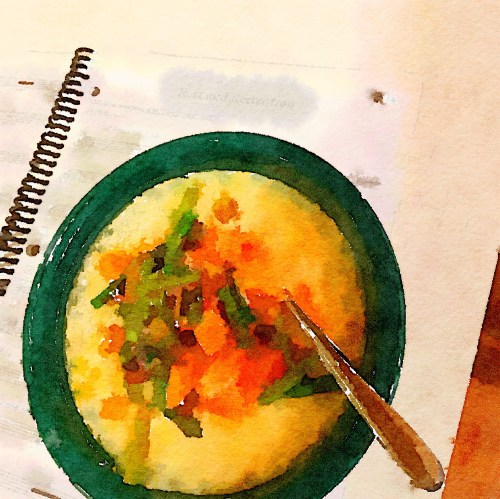When the grits are cooked (but a little looser than usual, because of the extra water), stir in the cheese; the whole thing will thicken beautifully. Ladle the cheesy grits into bowls, top with the shrimp and veg; top with scallion greens. Adjust seasoning to taste; if desired, add a bit more hot pepper sauce.