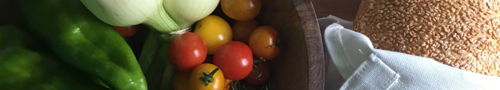 With onions, peppers, and tomatoes – and a mess of garlic and basil from the pantry – I can’t refrain from making a glorious pasta dish. We’ll roast and skin the peppers, roast and smash the garlic, char the onions, rough chop the tomatoes, and toss it all together with the slightest hint of olive oil. Clay makes a fabulous butter-lemon sauce for fettuccine – we’ll serve this saucy-salad alongside the pasta in the same bowl.