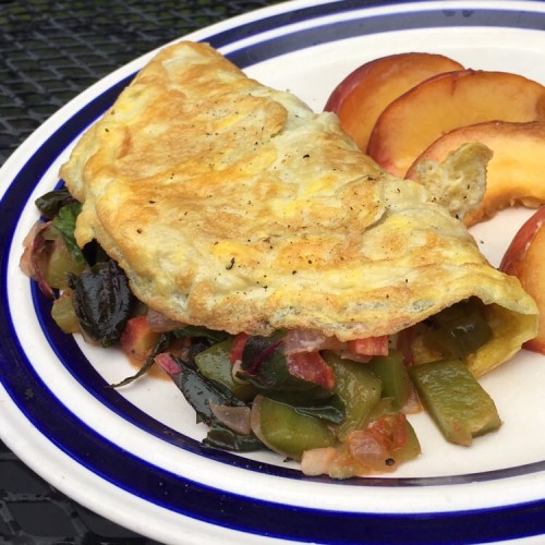 Slide your omelette onto a warmed plate, alongside a piece of hearty toast spread with tomato jam and some sliced fruit (peaches are divine just now). Hand the plate to your bleary-eyed spouse, along with a fork, a kiss, and a second-cup of coffee.