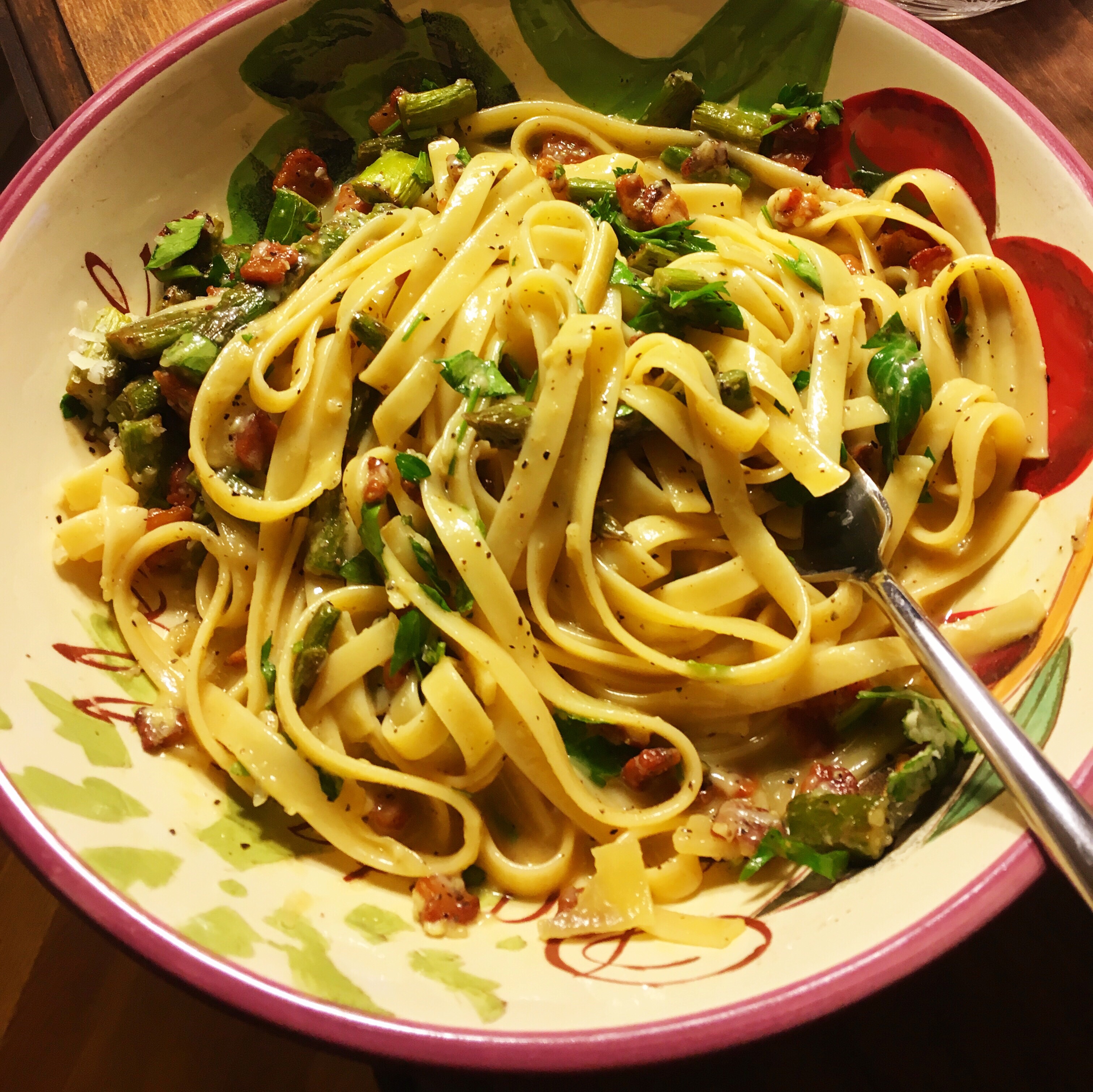 When the spaghetti is al dente, drain it, add it to the eggs-and-cheese bowl, and stir vigorously. This way, the hot pasta cooks the eggs gently—rather than pouring the eggs into the pasta pot, where they’d seize up instantly. Add the bacon and completely-non-traditional asparagus, stirred a little more to combine. Divide into the warmed bowls, and sprinkle the remaining cheese on top.